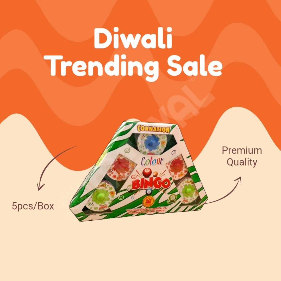 Color Bingo – 5Pcs/Box from Coronation Fireworks is a thrilling night cracker designed to revolve on the ground with eye-catching red, green, and white effects. Perfect for your Diwali celebration, this cracker delivers excellent quality, perfect timing, and a vibrant night display that adds sparkle to your moments. The revolving movement paired with multi-colour light trails makes it a must-have for all cracker lovers.
