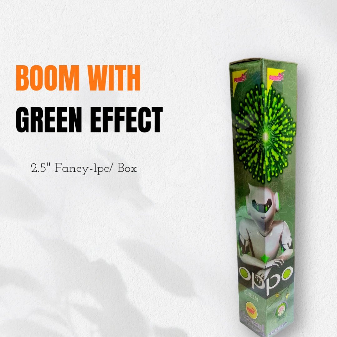 Celebrate this Diwali with the Oppo – 1Pc/Box (2.5 Inch Fancy Shot), a compact yet powerful sky cracker that dazzles with a vibrant green boom effect. Designed for thrill-seekers, this single-shot firework bursts high into the sky and lights up the night with a mesmerizing flash of green brilliance followed by a satisfying boom.