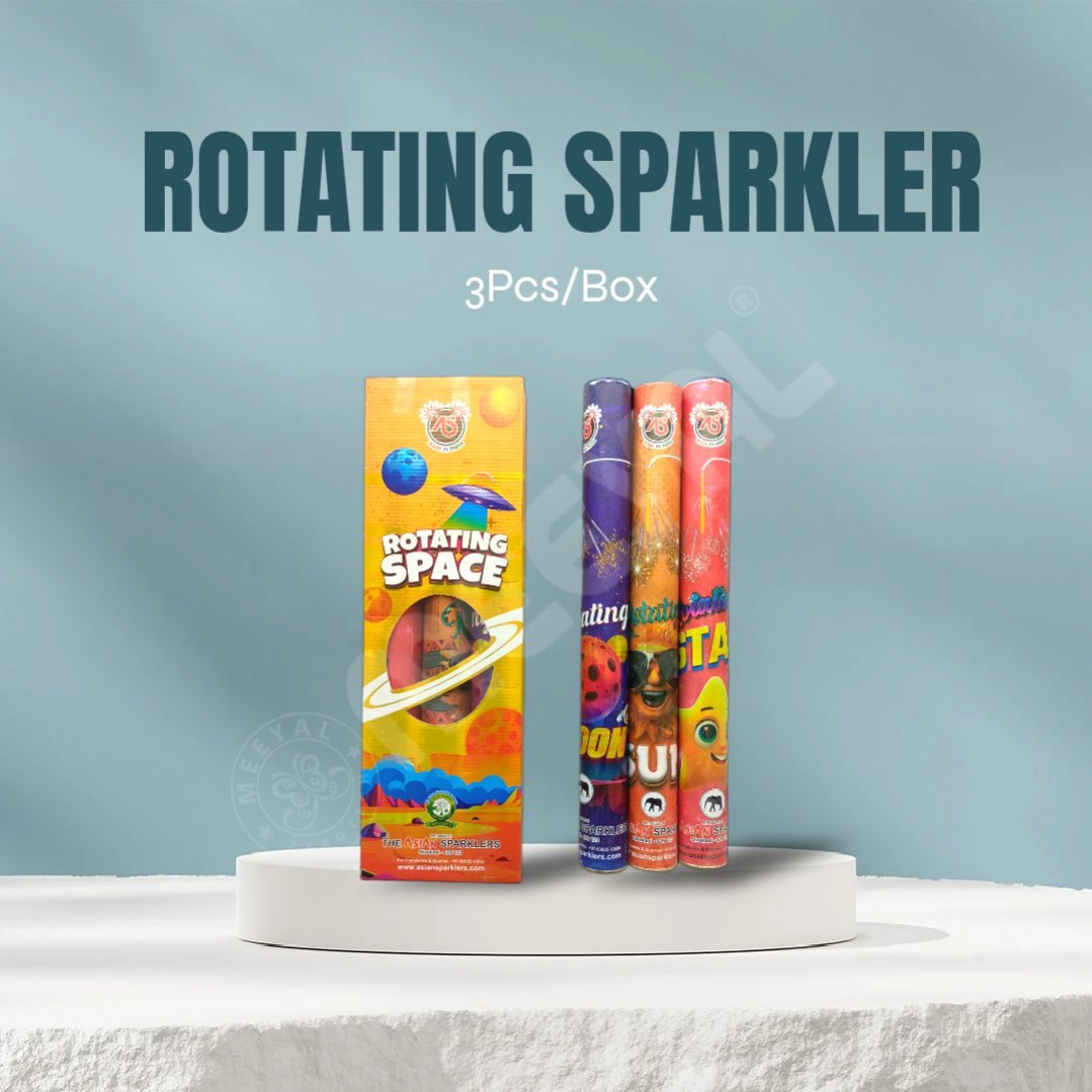 Light up your celebrations with the Rotating Sparkler Combo-3Pcs/Box from Asian Sparklers — a dazzling night cracker that spins with vibrant electric and green effects. Designed for festive joy, this sparkler delivers smooth rotation, bright visuals, and a safe burn time, perfect for evening fun and photo moments.