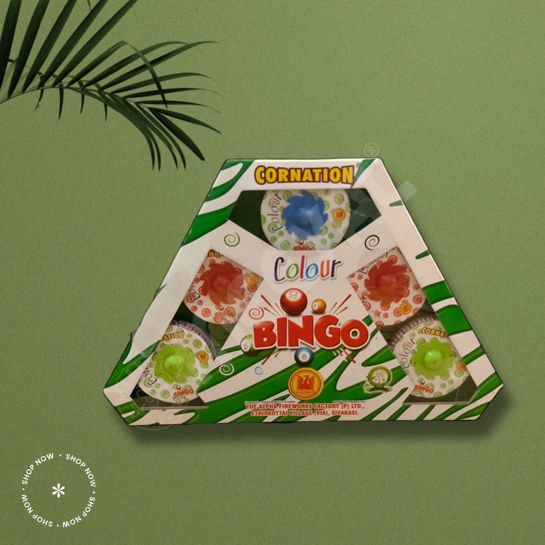 Color Bingo – 5Pcs/Box from Coronation Fireworks is a thrilling night cracker designed to revolve on the ground with eye-catching red, green, and white effects. Perfect for your Diwali celebration, this cracker delivers excellent quality, perfect timing, and a vibrant night display that adds sparkle to your moments. The revolving movement paired with multi-colour light trails makes it a must-have for all cracker lovers.